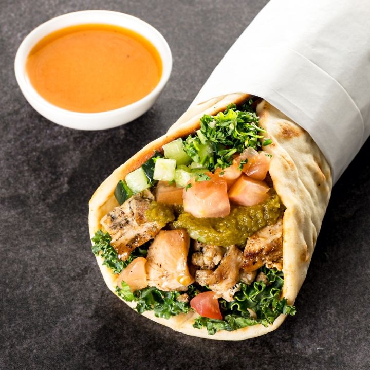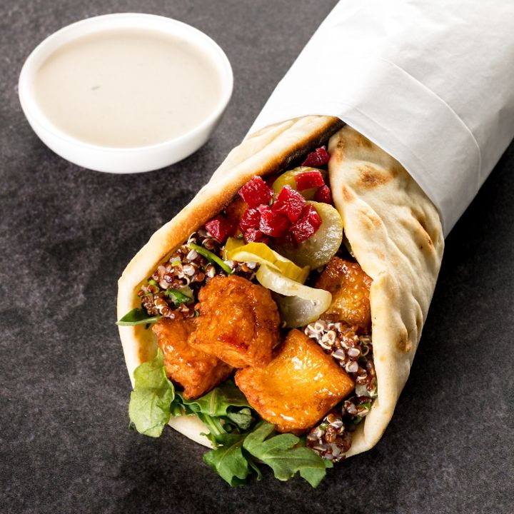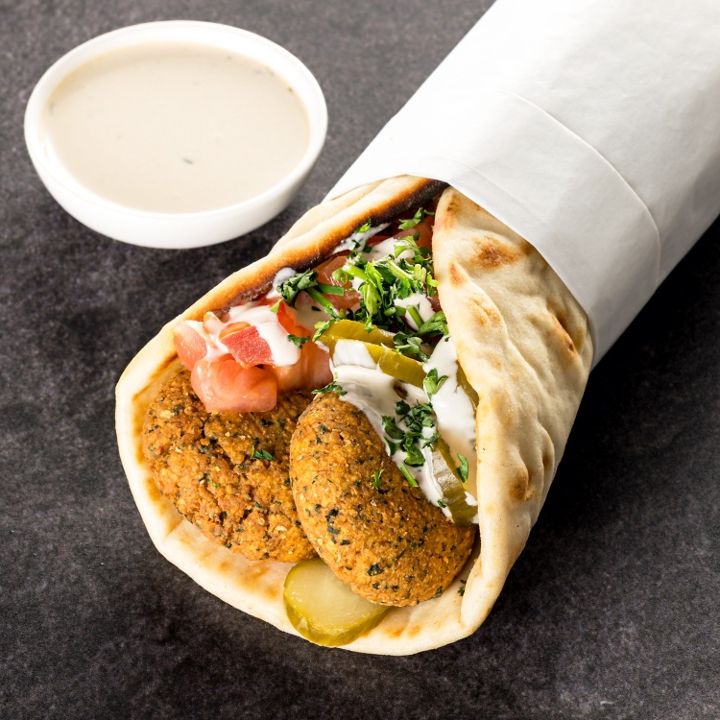 Traditional Falafel Wrap: Falafel, Diced Tomato, Mediterranean Pickles, Fresh Parsley, and Herb Tahini.