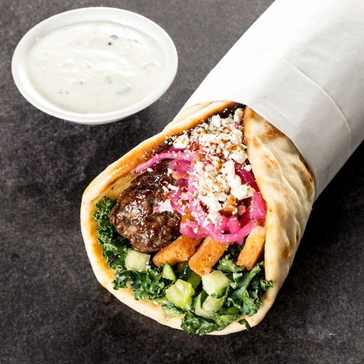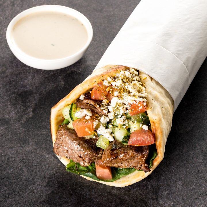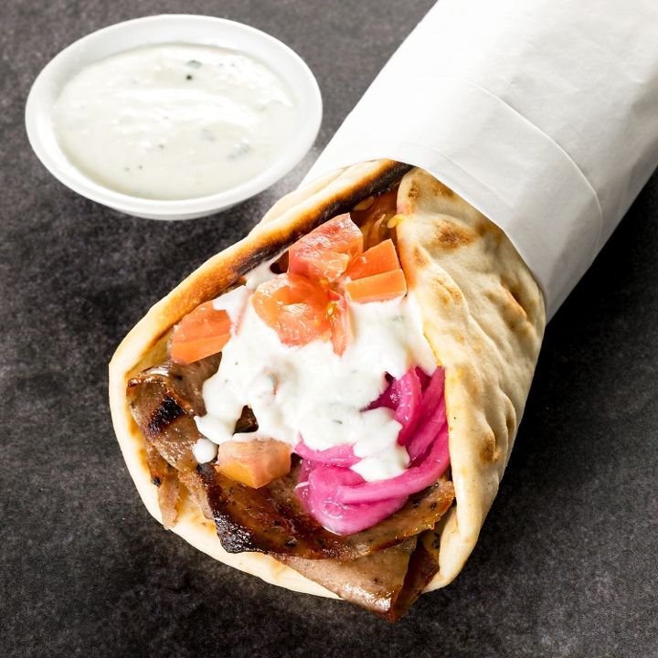 Traditional Gyro Wrap: Lamb & Beef Gyro, Pickled Onion, Diced Tomato, and Mint Tzatziki.