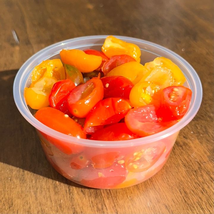 Juicy cherry tomatoes, seasoned to perfection with aromatic herbs and spices, bursting with fresh flavor.