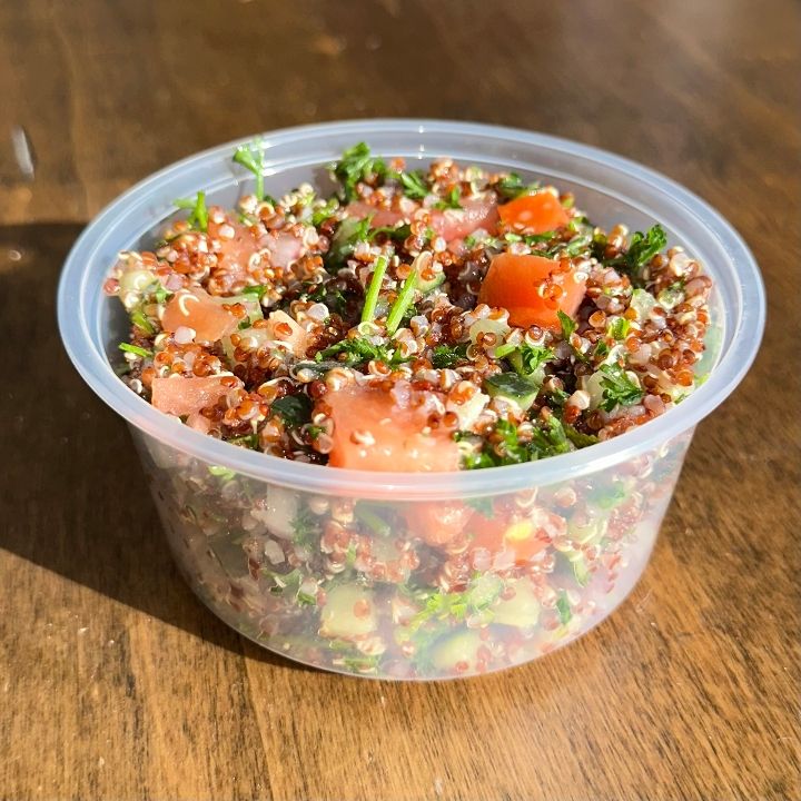 Fresh quinoa tabouli, packed with vibrant parsley, crisp cucumber, and juicy tomatoes, creating a light and flavorful appetizer.