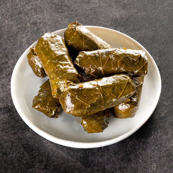 Vegan stuffed grape leaves with onion, rice, dill, and mint.