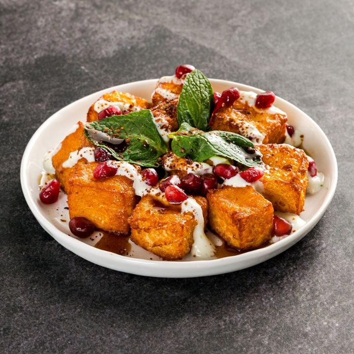 Crispy halloumi cheese, pomegranate seeds, fresh mint, pomegranate molasses, sumac, mint tzatziki, and Aleppo pepper flakes.